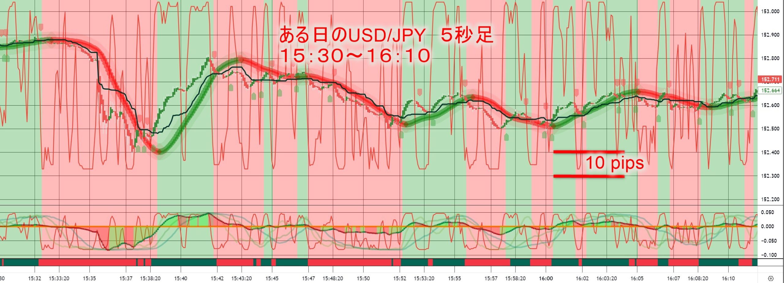 ある日のUSD/JPY、5秒足の15:30~16:10の40分間の動き。もしこれが5分足なら足は8本しか無いわけで、それで出撃撤退すべき場所、その方向性が読めるほうがおかしくないですかね。