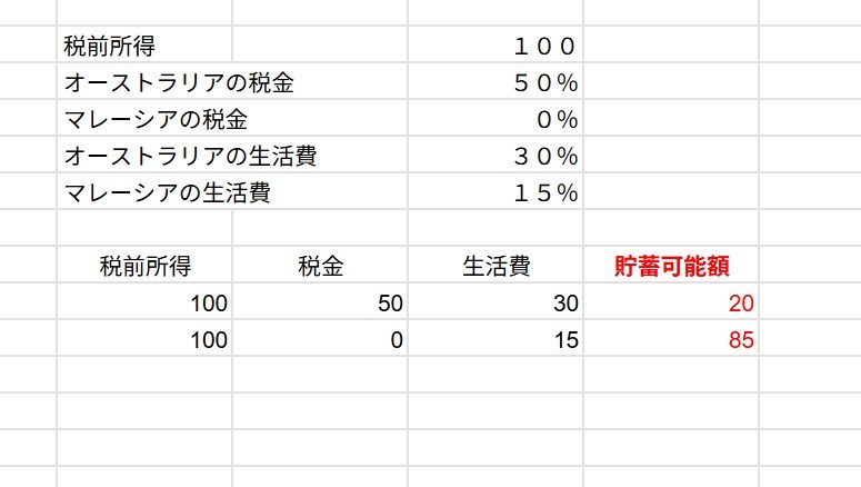 収入は変わらず、支出(生活費)は半分とする。税金はオーストラリアは50%、マレーシアは0%とする。