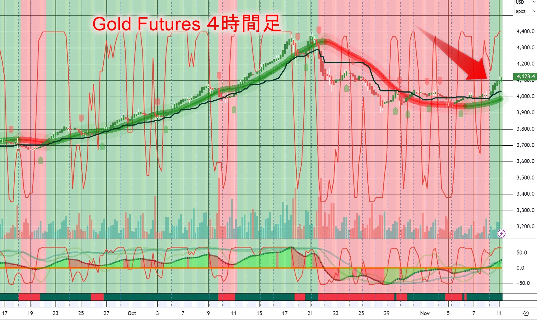 今までの下げは「調整波」で、これから元の上げトレンドに戻るとも読めるし、逆に「下げ波動の戻し」とも読めますが、この上げ波動の始まりは11月5日から始まり、今の上げは【第三波】の可能性も高くて、エリオット波動のカウントで言うと「逃してはならない動き」とも言える。