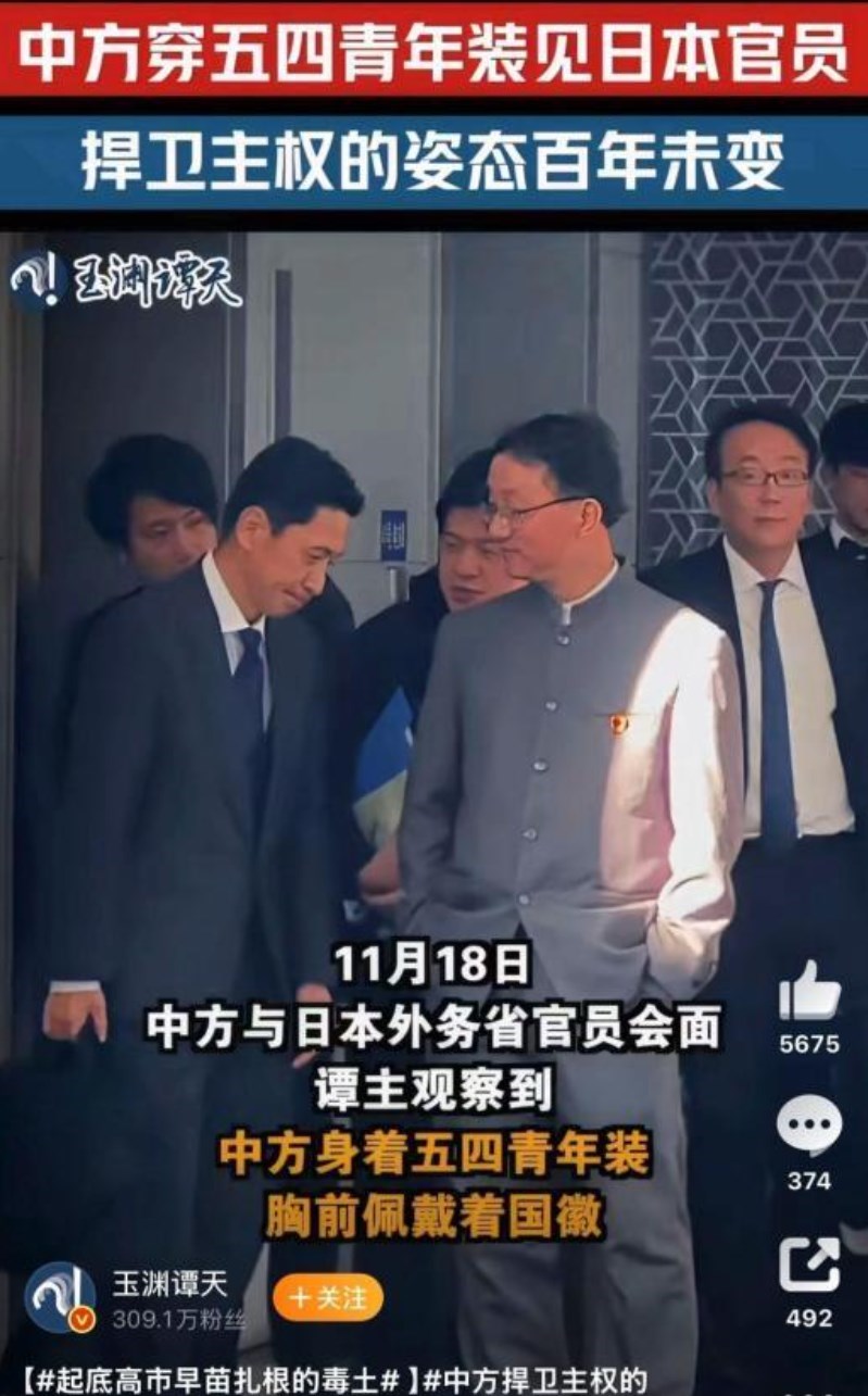 18日に外務省の金井正彰アジア大洋州局長と、中国外務省の劉勁松アジア局長との会談が北京で行われ、その会談後、劉氏は胸を反らして両手をポケットに突っ込んで歩き、その横で、通訳の言葉に耳を傾けている金井氏が、少し頭を下げているように見える映像や写真が、中国メディアを中心に公開された。
