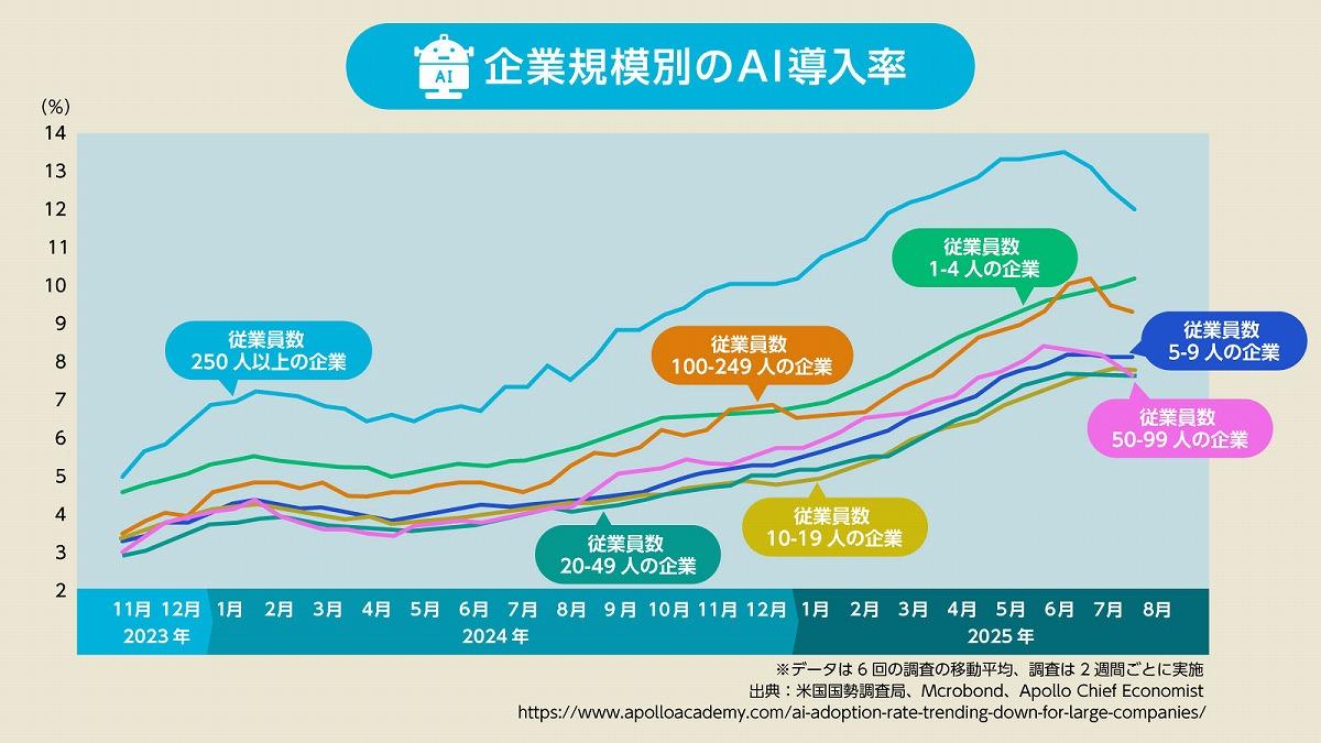 AIがもっと広く普及して、実際に利益を生み出すのは「これから」みたいな気もしますが、【慌てて飛びついたけれど、活用するのは難しい】となれば、AIを利用する側の「熱量も下がる」んじゃないですかね。そしてAI導入率も「下げ始めている」のがわかっている。