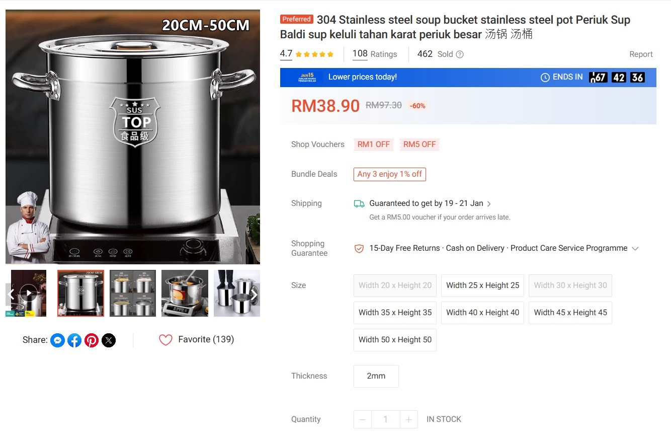 ただのステンレス製の大きな鍋(12リッターぐらい)なんですが、前のは「サビがあちこちに出てきた」から買い替えだったのですが、Shopeeで見ている時に「安いものが多いなぁ」とは思ったものの、ほぼ全てが同じ様な感じだし、その中でも「厚手のステンレス」で、「IH対応」で、なおかつステンレスの材質は「SUS304(18-8)」なので大丈夫だと思ったんですよ。