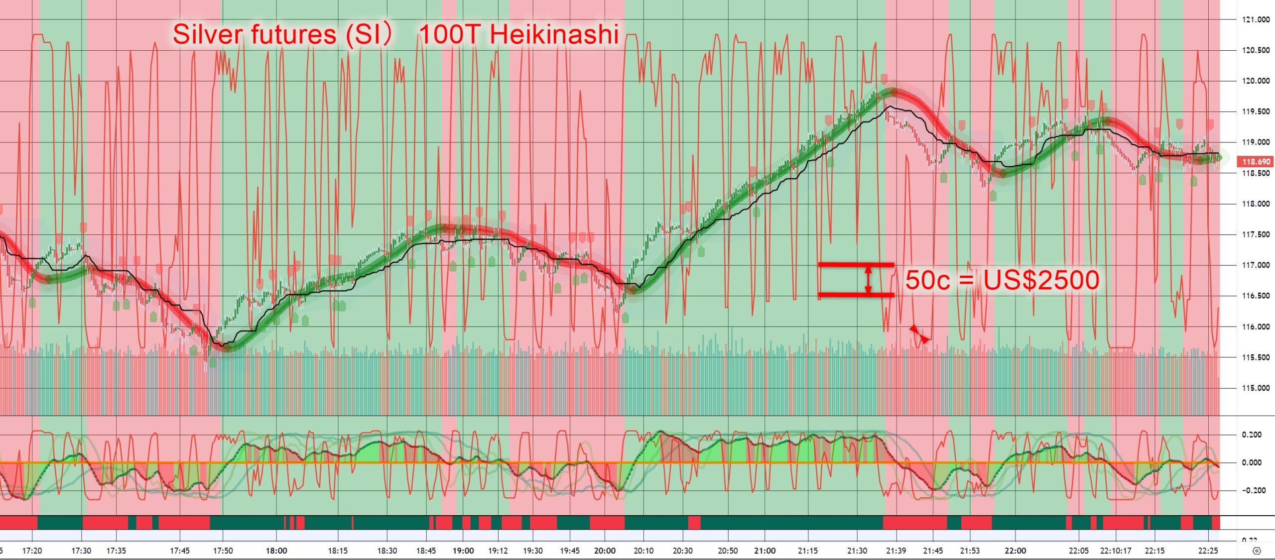 また普通のローソク足+秒や分足のチャートで見ると結構乱高下して見えるので、私は100ティク足+練行足が良いと思う。ピコピコ動くのに惑わされること無く「大きなうねりを掴み、小さな利幅を狙う」戦略。ま、それが私の基本ですが、今の銀(シルバー)だと「うねりが大きい」ので結構値幅も稼げる。でも先物での1ドルの動きは5000ドルの動きなのでデイトレ初心者はかなり気をつけないとうまくない。E-マイクロでも5分の1で1ドルで1000ドルの動きだから注意。ただボラが高いからスプレッドも手数料も「無視できるレベル」なのは良いと思う。