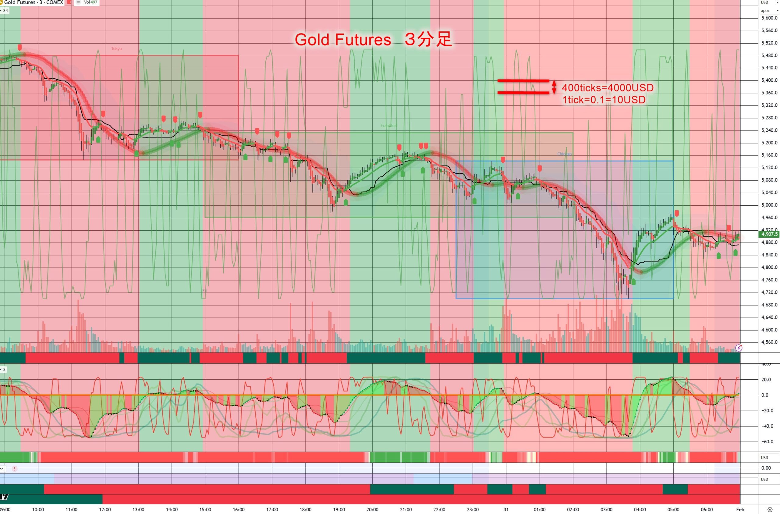 とりあえず3分足で「日本時間、ヨーロッパ時間、アメリカ時間の動き」を見てみる。このチャートのY軸は一マス40ドルで、先物の1ティックは0.1ドル=10ドルだから一マス400ティックで4000ドルの動き。