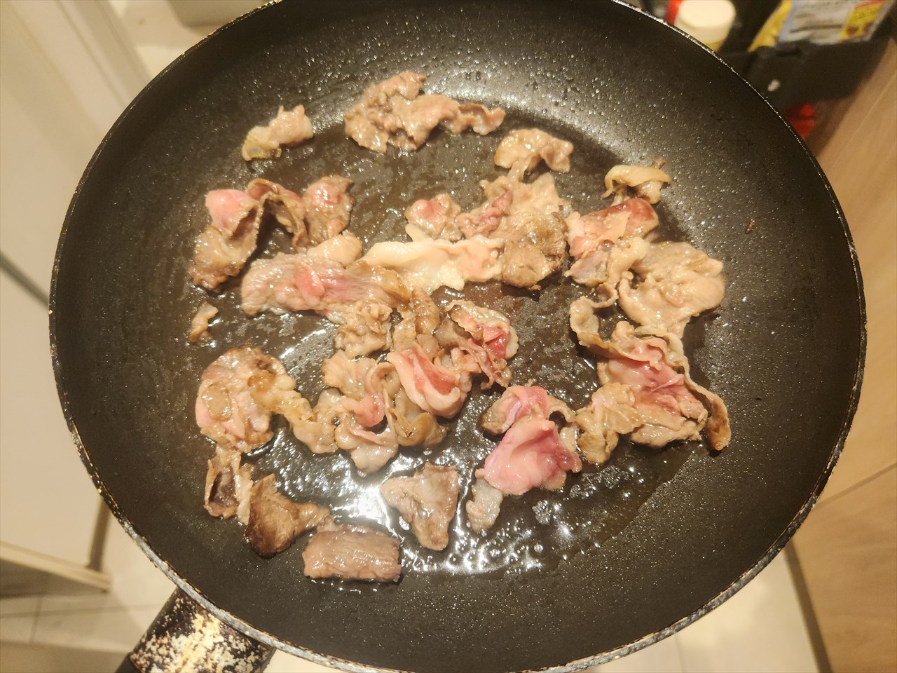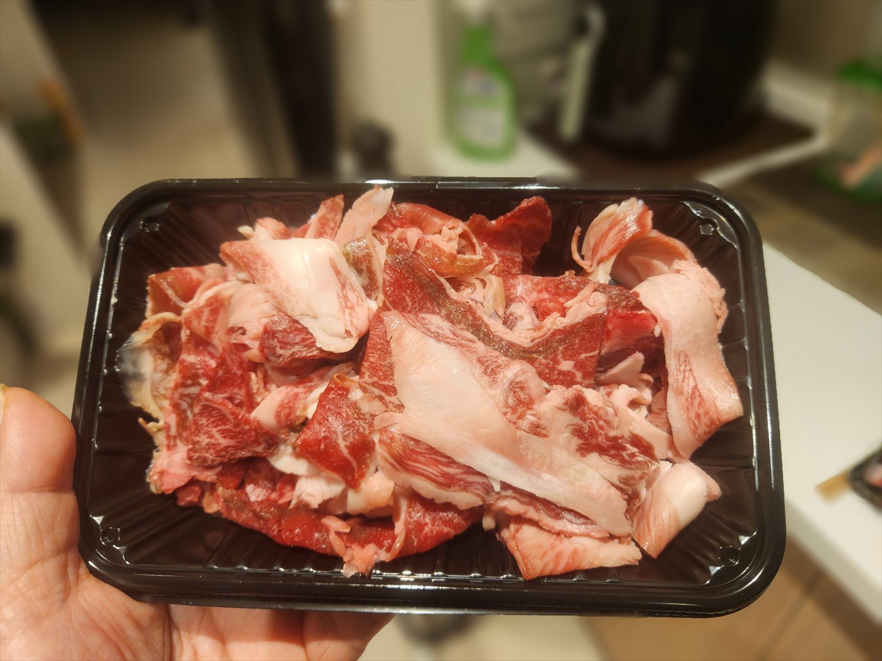 どちらにしてもヨメさんの評価は「クズ肉」で、ではヨメさんがどうしたかというと、もう一つの「しゃぶしゃぶ肉」と合わせて使うということ。でも比率は「クズ肉2、しゃぶしゃぶ肉1」の割合。