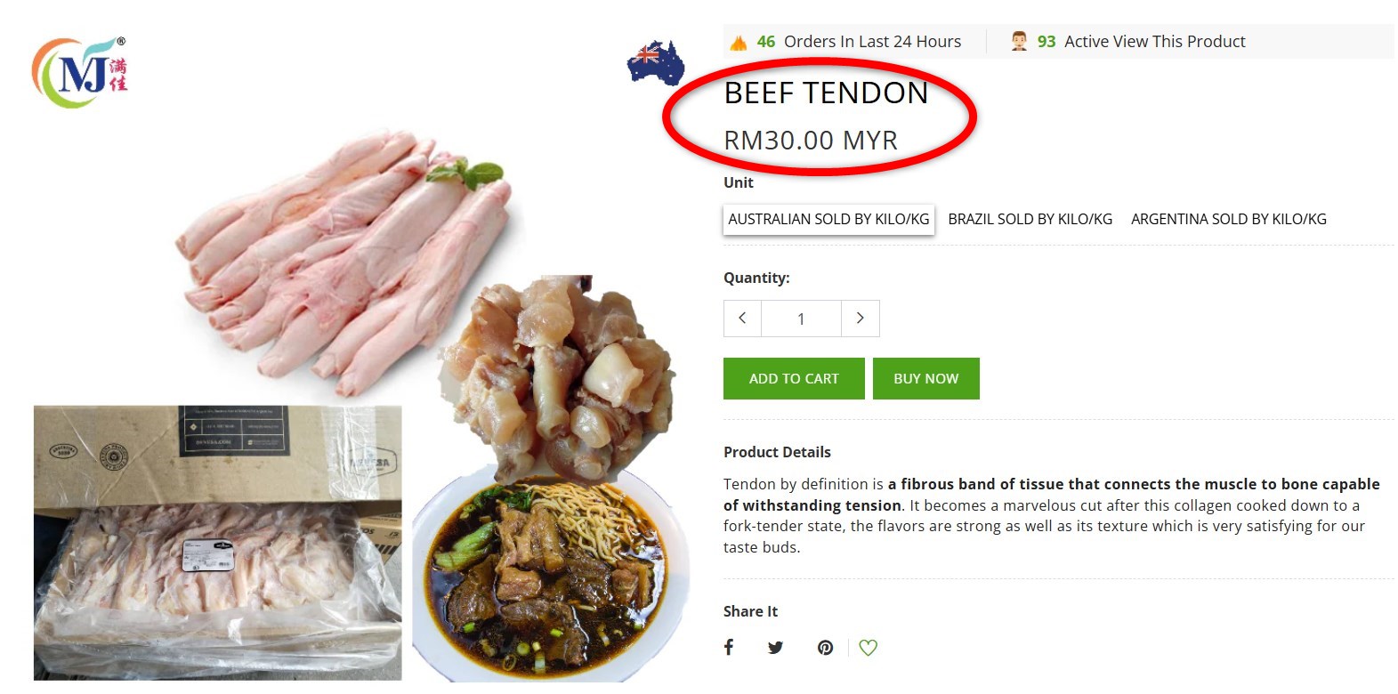 オーストラリア産で1キロRM38。約1500円。良いと思う。「アキレス腱は英語でTendon」ね。これは(何でも安い)Manja Foods Supply(ここをクリック)。
