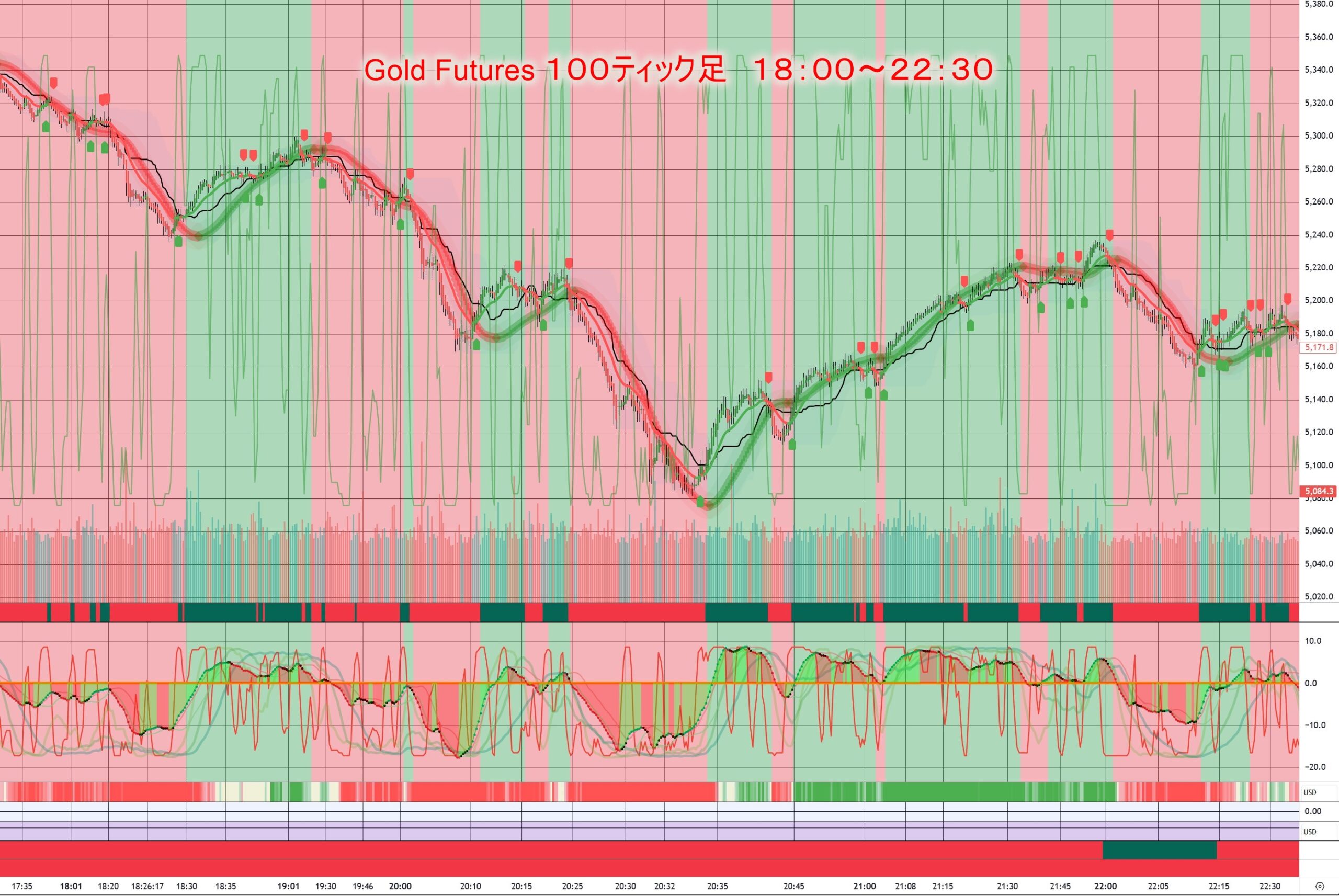 ま、正解だったと言って良い動き。日本時間18:00~22:30の動き。100ティックチャート。