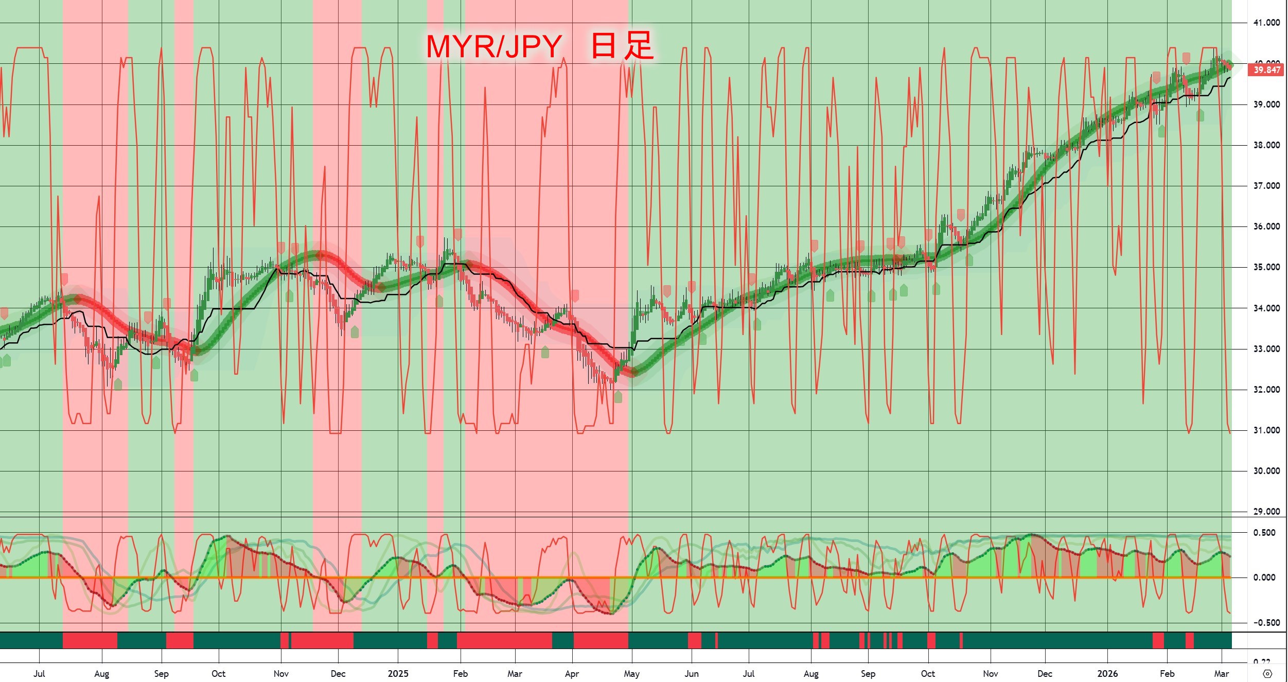 日本円は私には関係ないけれど、「MYR/JPY」の日足。