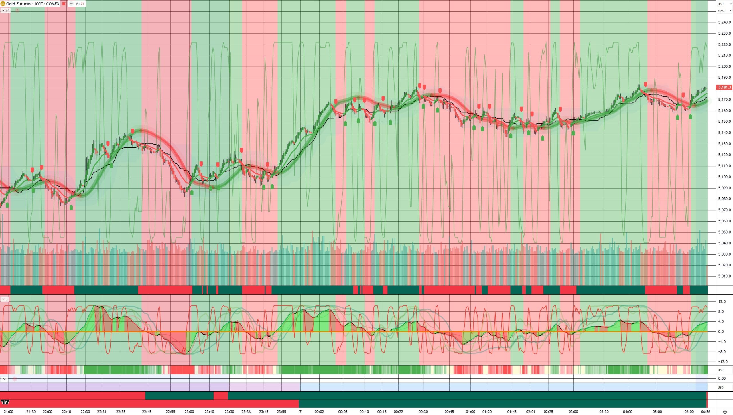 Gold futures (GC) 100ティク足 直近の動き。