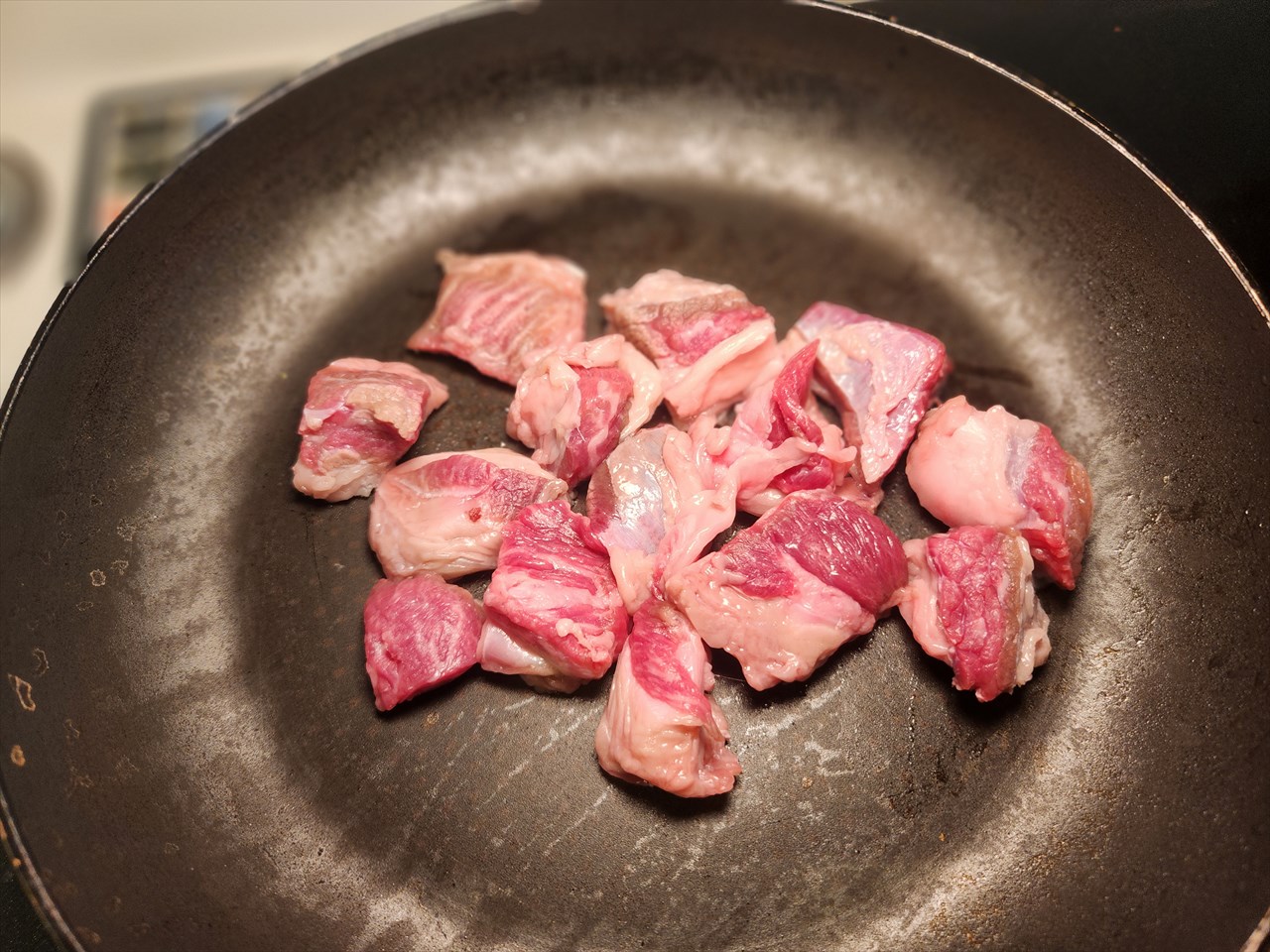 まず、この不要部分というか「スジの部分だけをしっかり焼く」事から始めます。火を通すという感じじゃなくて「かなりしっかり焼く」事が重要で、そうじゃないと食べられない、噛み切れない。また、お上品は方はこういう部分は食べないでしょうが、私達家族はこういうスジをしっかり焼いて食べると「半端じゃなく美味しい」のがわかっていますし、焼かなくても「煮込んだら美味しい」のも間違いがない。