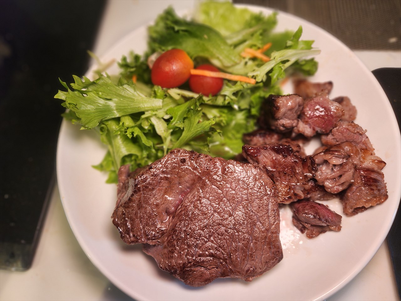 こうやって見ると普通のステーキに見えますが、「ほとんど火が入っていない状態」で、でも「生に近い」状態。レアよりも「生」。