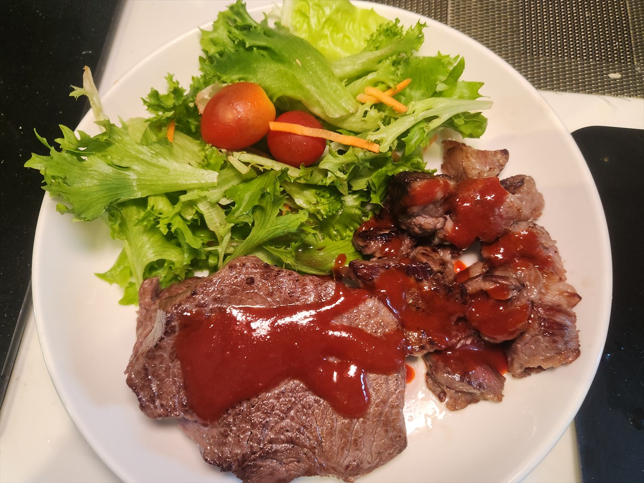 問題はソースなんですが、一応安くても「和牛」ですし、美味しいことは美味しいのですが「イタリアのビステッカみたいに塩とオリーブオイルだけ」もなんだかイマイチで、かと言って手が込んだソースは和牛の良さを駄目にすると思うし、試行錯誤の上でこれが良いと思ったのが「コチュジャン」です。味噌のコチュジャンではなくてソース状のコチュジャンがあるのですが、それを掛けるだけで「完璧」だと思ってます。これは「意外な発見」で、韓国風のユッケにも似た、面白いステーキで美味しいと思います。