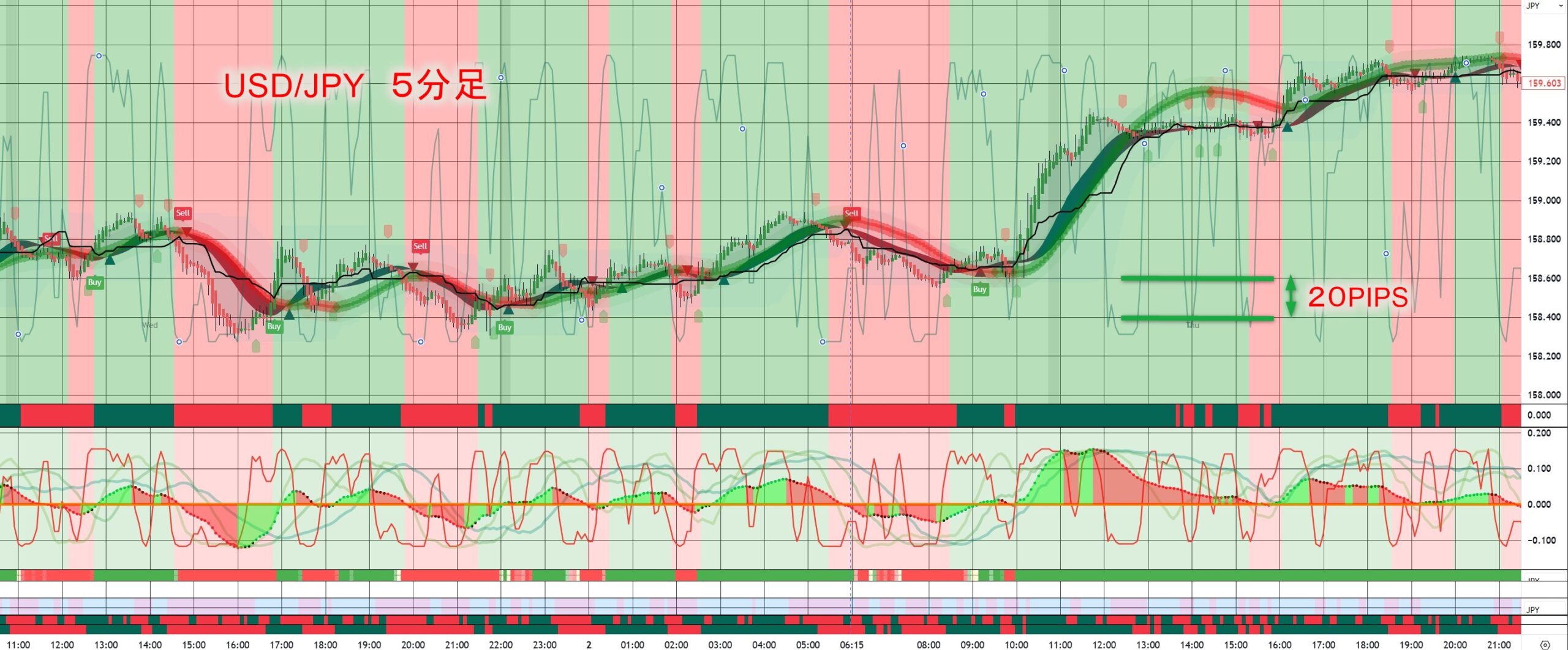 上のチャートは5分足でY軸の一マスは20ピップス。この一マスは10万ドル通貨で2万円。100万ドル通貨で20万円の動き。