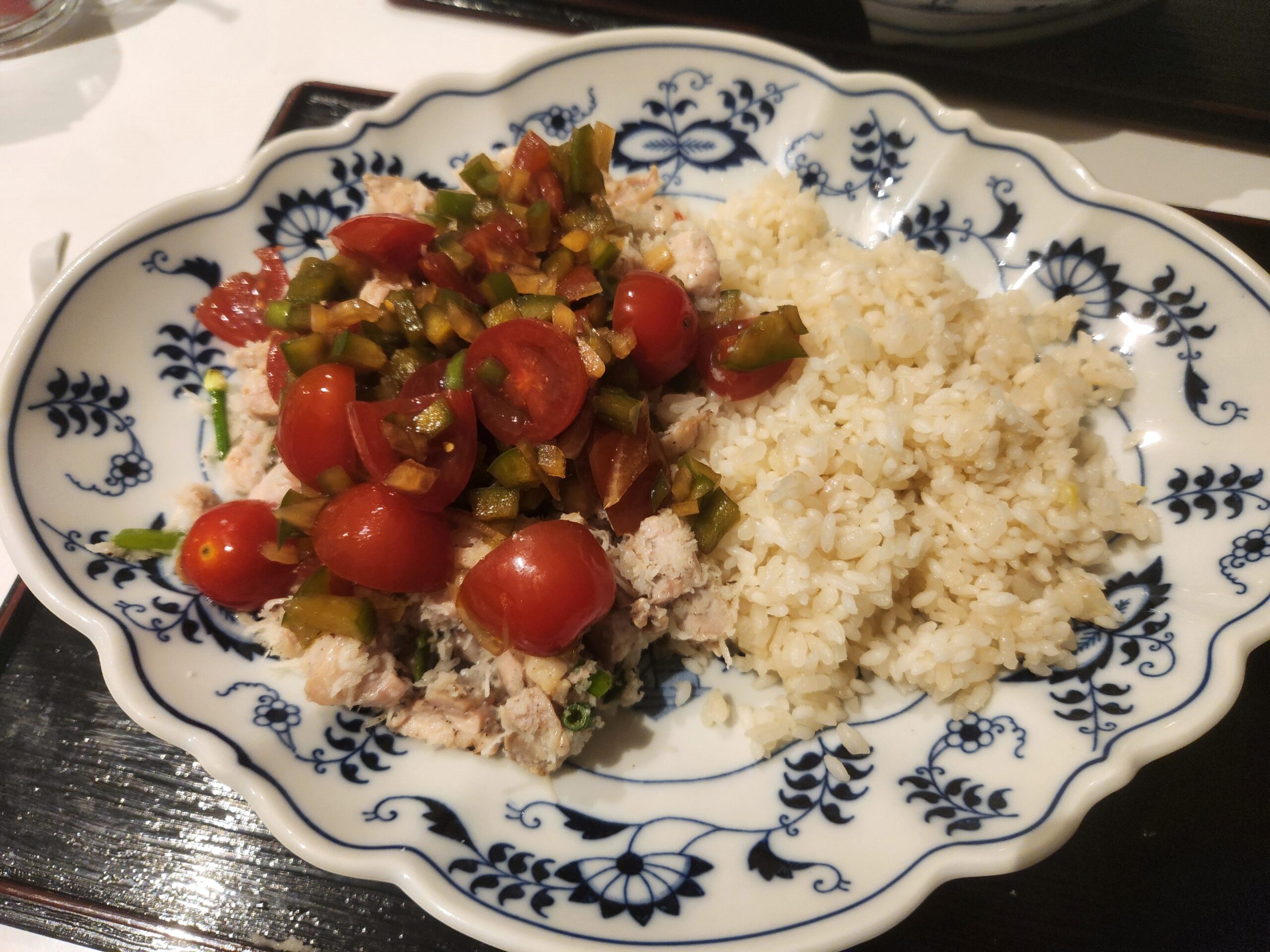 焼いた鶏のモモを割いて、フレッシュココナッツと合えたもので、それに醤油とお酢ベースの「フィナデニソース」を掛ける。ご飯は「ココナッツミルク」で炊いたもの。
